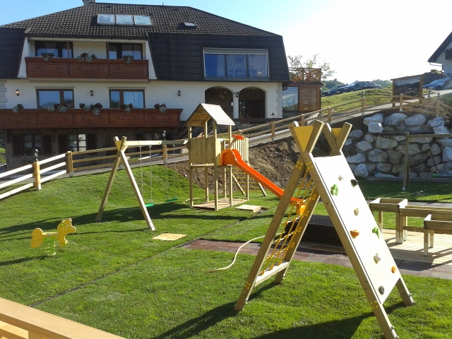 - Veliko igrišče s slapom – Postavljeno je tik ob restavraciji in tako lahko mirno uživate svoje trenutke, medtem ko bo vaš otrok zaposlen s plezalno steno, toboganom, gugalnico in pravim malim slapom.