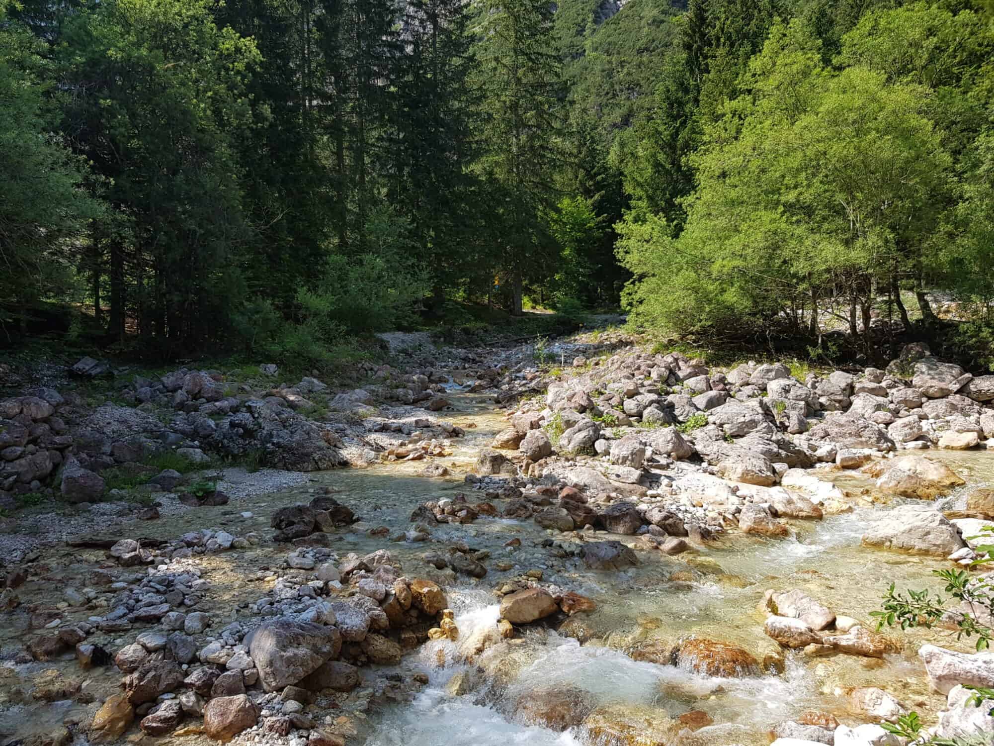 Tako smo pot pričeli na cesti čez Vršič, kjer sledimo tablam za Krnico. Pot se najprej spusti po kolovozu čez gozd, po kakšnih 10, 15 minutah pa se pokrajina zravna in prispemo do lepega vodnjaka s pitno vodo in zvončkom, ki bo zanimiv za vse starosti mulcev.