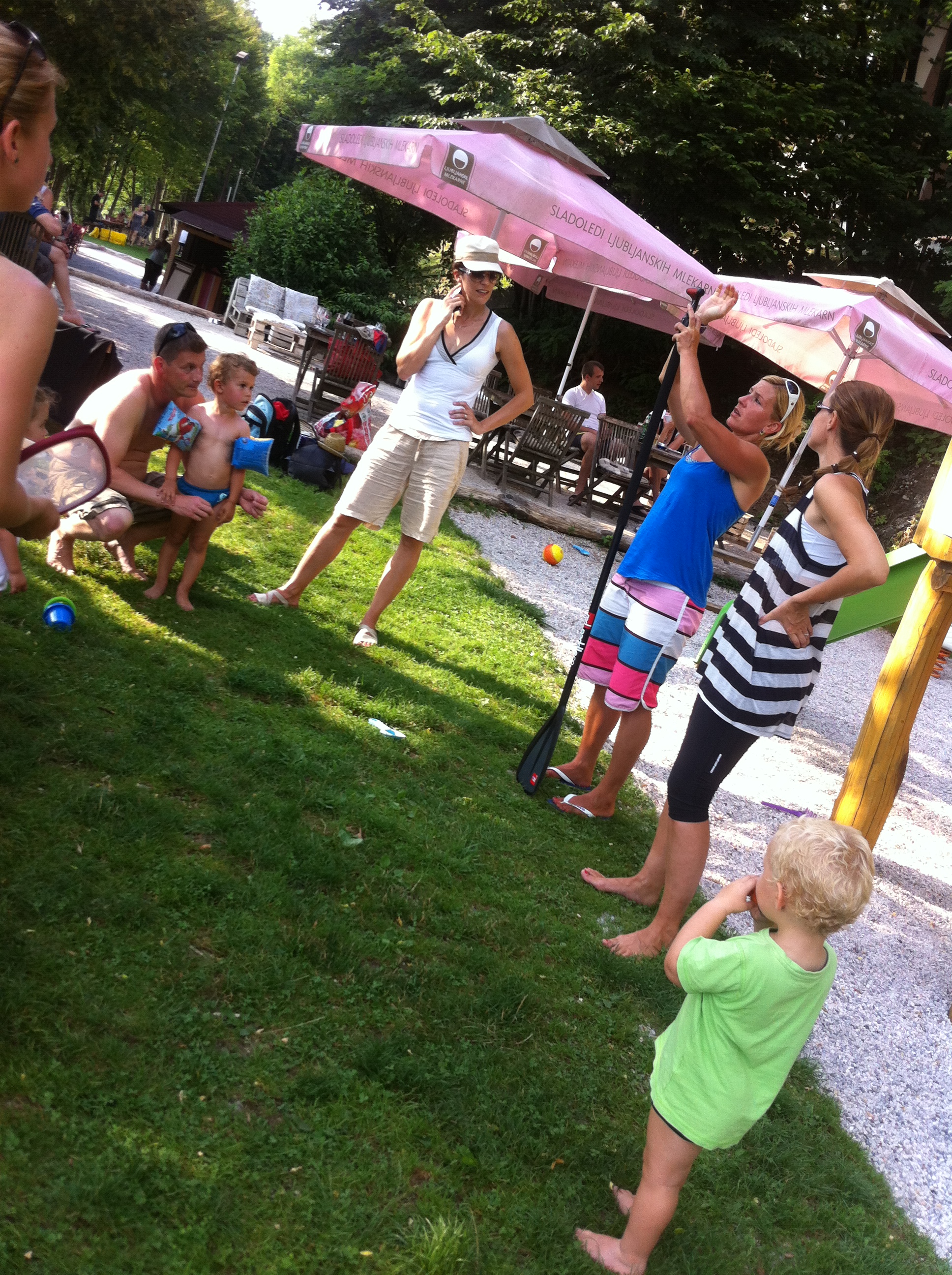 Parkirali smo ob cesti in se po daljših stopnicah spustili do jezera. Na desnem bregu jezera je travnik, s številnimi »piknik« dekicami, na levem bregu pa mimo bara pridemo do otroškega igrišča in pomola. Ob njem so nas čakali SUP vaditelji iz Amfibija Waterfront. Ti so nam pokazali opremo – desko in veslo in nas na kratko spoznali z osnovami SUPanja. Ker smo želeli, da bi tudi naši mulci zajadrali po jezeru z nami, so nam priskrbeli tudi otroške rešilne jopiče in rokavčke.
