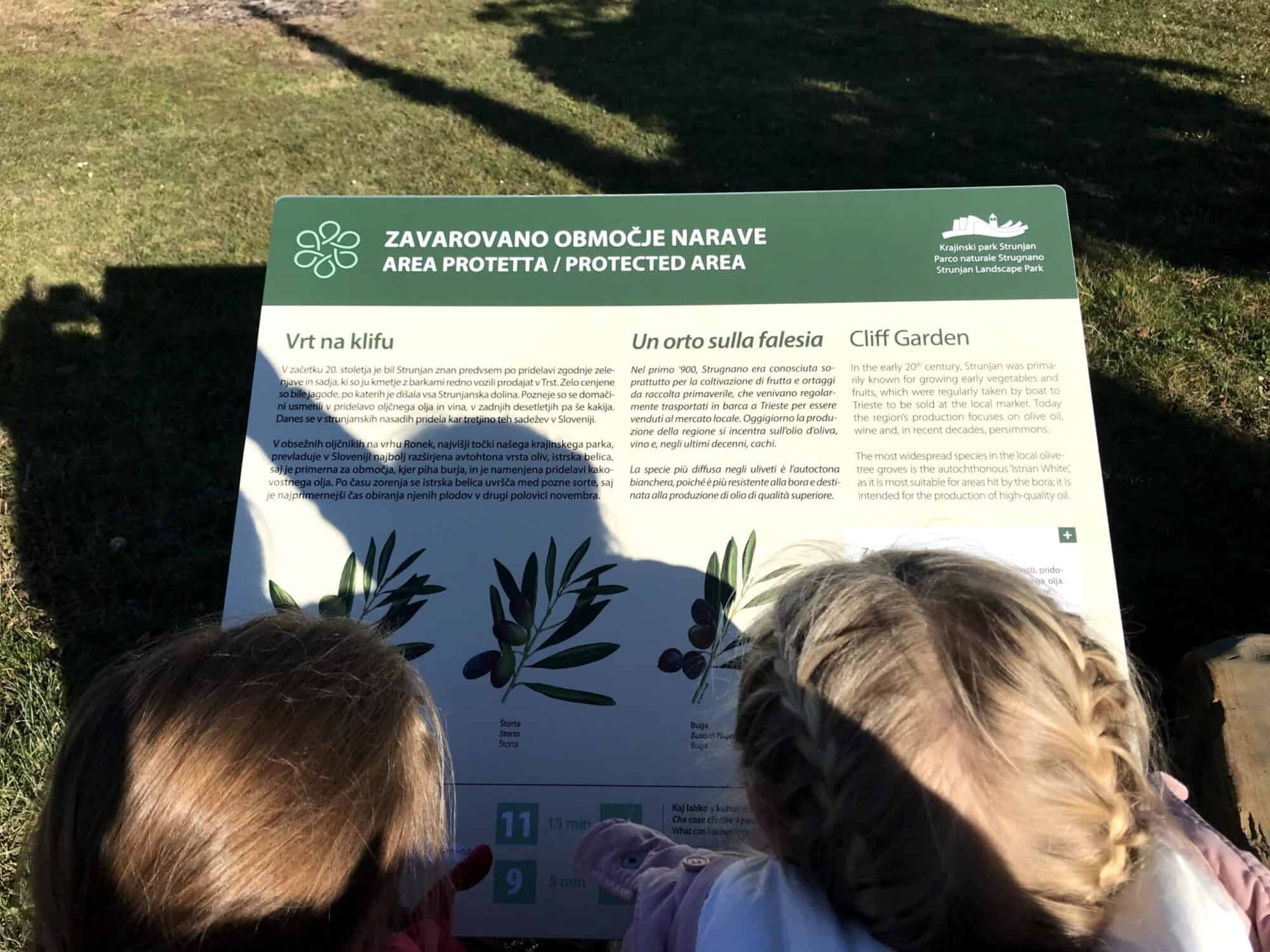Na poti so se otoci poigrali na travniku nasada oljk. Ena izmed informativnih tabel obiskovalca informira tudi o oljkah in njihovih značilnostih.