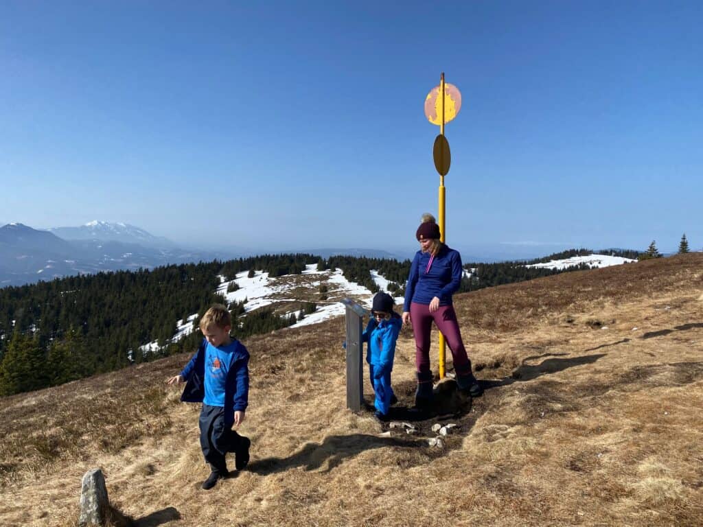 Na vrhu smo se srečali z našo smučarsko ekipo. Po malici z res lepim razgledom na Koroško in obisku energetskih točk, pa se je del ekipe do izhodišča spustil s smučmi, drugi del pa kar s sankami. Bodite previdni in pazite na pohodnike, ki se vzpenjajo na vrh.